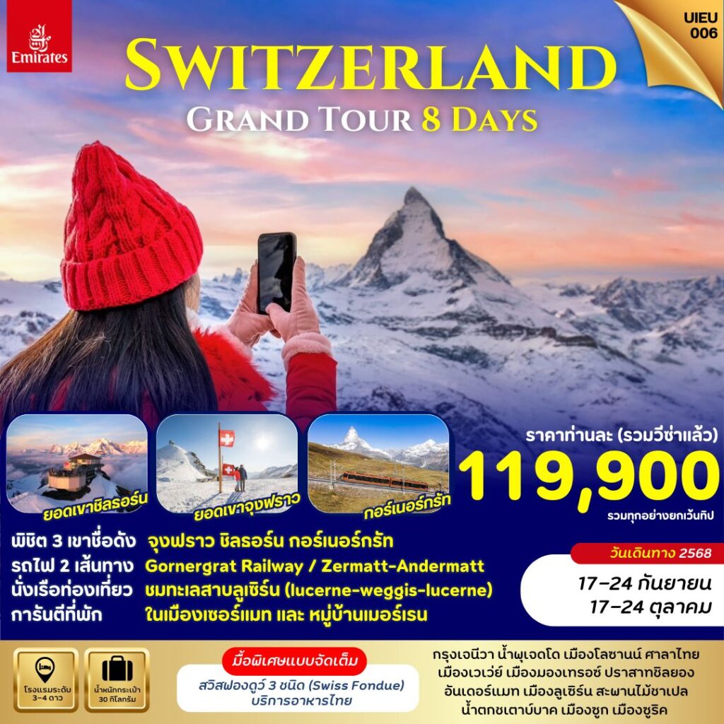 ทัวร์แกรนด์สวิตเซอร์แลนด์ พิชิต 3 ยอดเขา จุงเฟรา ชิลธอร์น กอร์เนอร์กรัท 8 วัน 5 คืน By Emirates